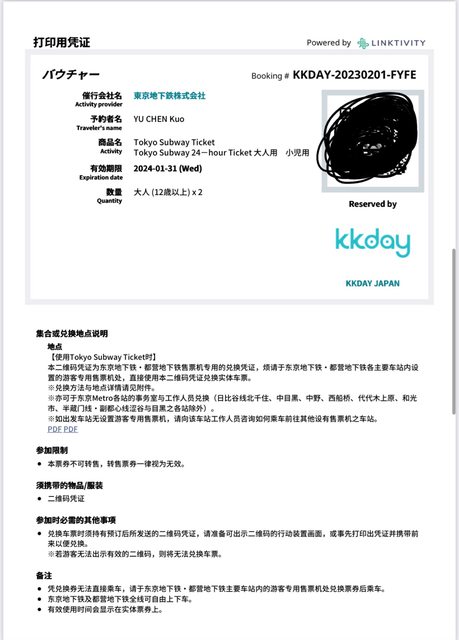 1. 讓售品項:東京 subway 24小時票券*2