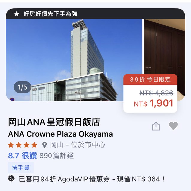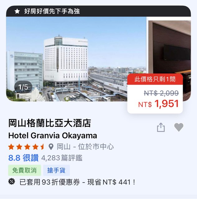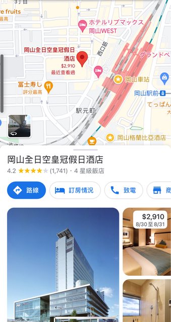 8/28我的生日即將第一次去日本岡山玩! 現在正在找住宿找了四間 不知道有沒有玩過岡山的 可以從這4間推薦哪一間嗎? 第一間:ANA皇冠假日酒店 https://i.imgur.com/gRKhk5J.jpg