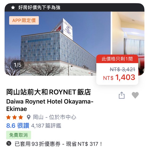 likeilike : 請問APA岡山站前和AreaOne 有推嗎? 08/15 08:30