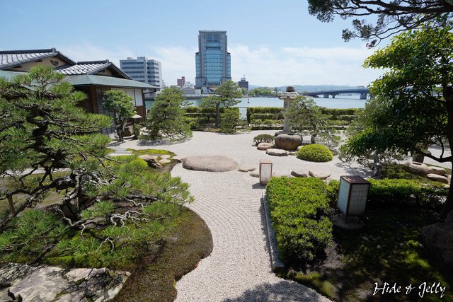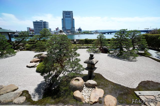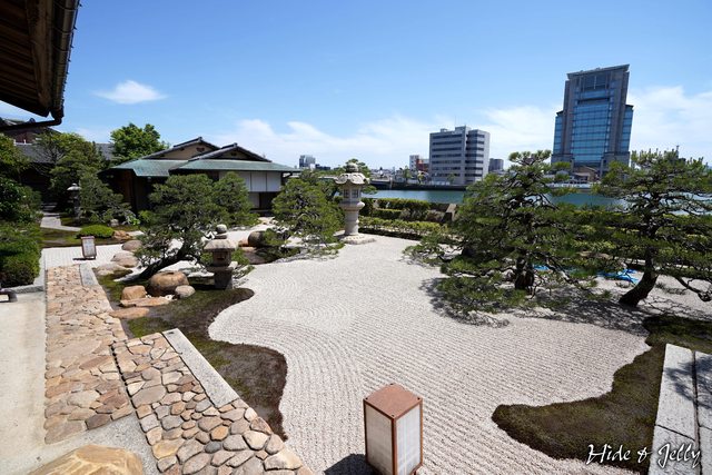 皆美館的庭園是承襲松平不昧公的出雲流庭園,包含一旁的茶室,庭園中的手水缽、石燈