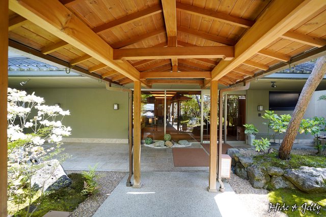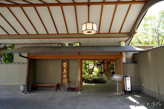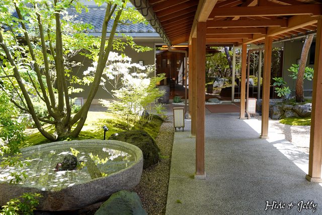 走進皆美館的大門,迎賓的長廊兩旁,就是很厲害的日式庭園,一旁的大水缽也相當少見