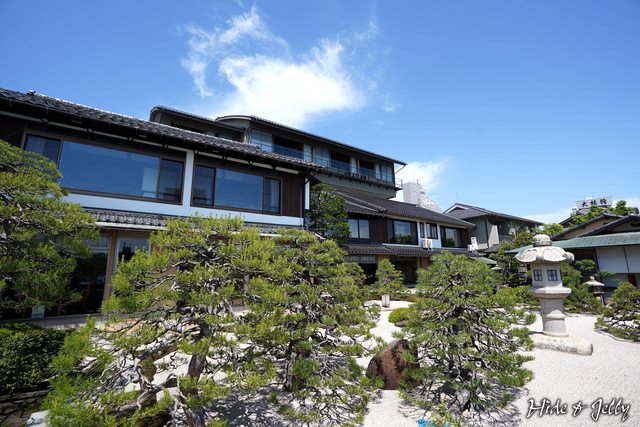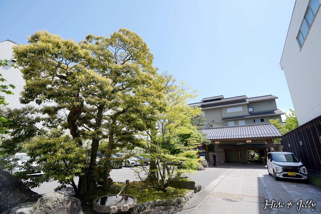 回頭看,可以看到皆美館的左二層右三層建築物,古色古香的日式建築,與一排松樹,中