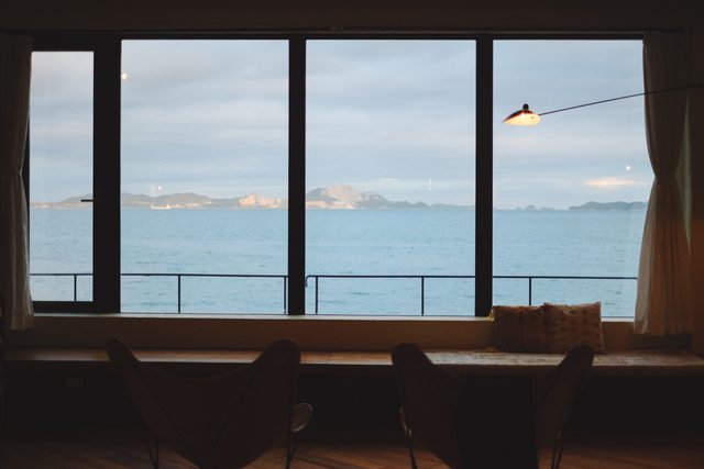 隨著天色漸暗,從室內能拍攝出如剪影般的效果。瀨戶內海的藍實在太過迷人,不管從哪