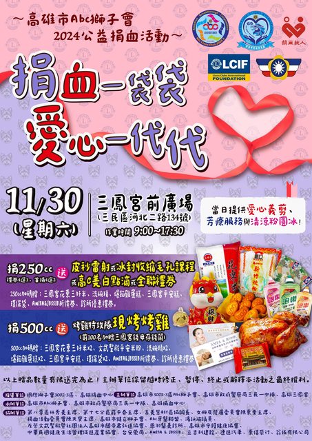 地點:三鳳宮廣場、九如捐血室(贈品烤雞、禮劵)。