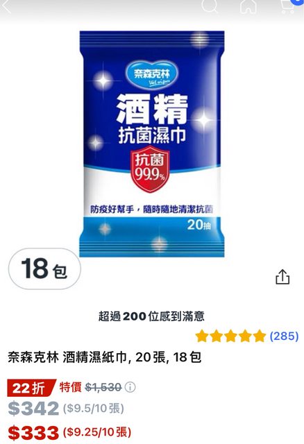 : 酒精濕紙巾 20抽*18包