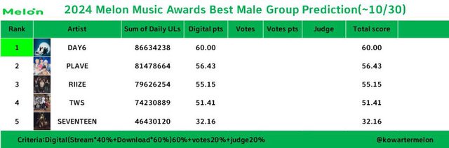 目前預計DAY6在音源 (佔60%) 方面將獲得滿分