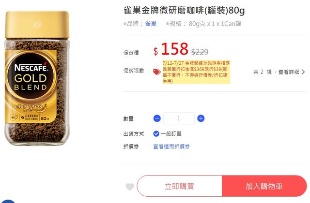 雀巢金牌微研磨咖啡(罐裝)80g $ 158 https://i.imgur.com/YZTfhOy.jpg