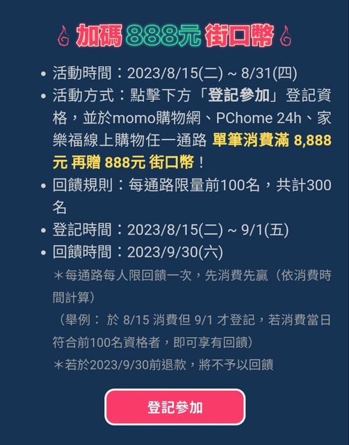 推 Kazamatsuri: 剛剛往下滑發現滿額贈888的MOMO/PCho 39.10.42.168 08/16 20:19