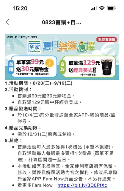 標題[情報] 全家FamiNow首購99送30購物金 自取129送中杯美式