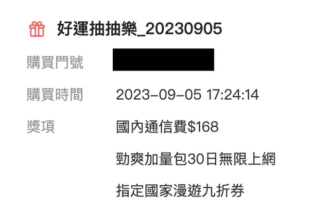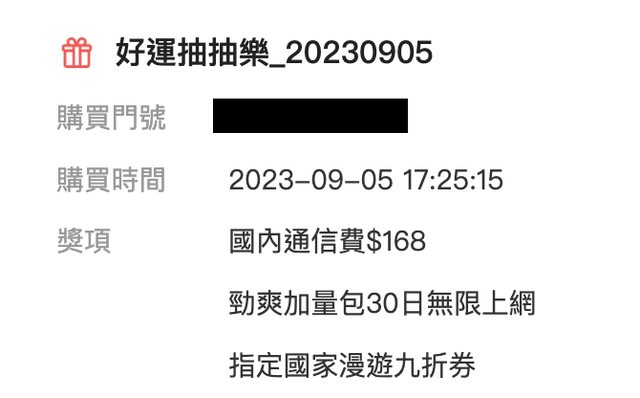 已經有板友分享資訊了! 但Reg大是用到新年的標題XD 我太晚才發現… https://www.ptt-club.com.tw/Lifeismoney/M.1693362221.A.436 分享一下我前幾天發薪水 單日十連抽的狀況 1. 10GB/Hami書城一個月 2. 8GB/漫遊九折券 3. 8GB/Hami書城一個月 4. 6GB/Hami市集百元折價券 5. 6GB/Hami書城一個月 6. 8GB/漫遊九折券 7. 30日無限上網/漫遊九折券 8. 8GB/Hami書城一個月 9. 6GB/Hami書城一個月 10. 30日無限上網/漫遊九折券 九月這檔中華的抽抽樂手氣不錯 十抽出了兩次30日網路吃到飽 https://i.imgur.com/astOYsR.jpg