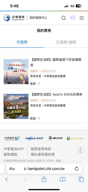 中華電信VIP可以領日韓5g漫遊券, 限量兩萬份 https://vip.cht.com.tw/international/?utm_source=news&utm_medium=referral&utm_campaign=news_202309_international&utm_id=news_202309_international https://i.imgur.com/keOwU8Y.jpg