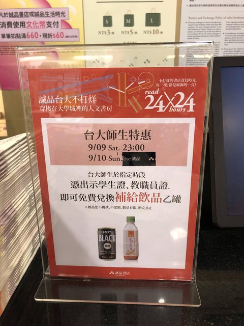 9/9 23:00 ~ 9/10 09:00 台大師生憑出示學生證、教職員證,即可免費兌換補給飲料乙罐。 ————————— 活動改成須有台大師生證件+消費+誠品會員。 https://i.imgur.com/sGvXe2S.jpg