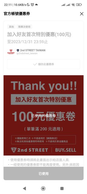 今天去宜蘭家樂福門市, 結帳時店員說, 掃qrcode加入line官方帳號, 單筆滿$200折$100。 https://line.naver.jp/ti/p/@2ndstreet_taiwan 優惠券僅限用一次 https://i.imgur.com/iLr6mnx.jpg