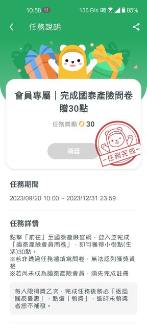 如題 在國泰優惠的任務牆裡 需登入或註冊國泰產險帳號 問卷不長 大約3-5分鐘,填完就會通知你可領取小樹點,限量5000份 https://i.imgur.com/d6a1HMv.jpg