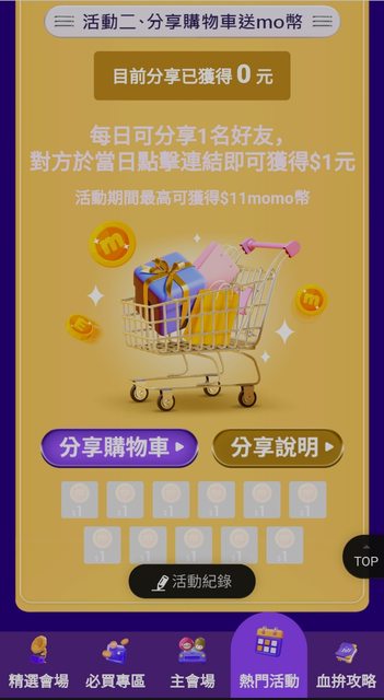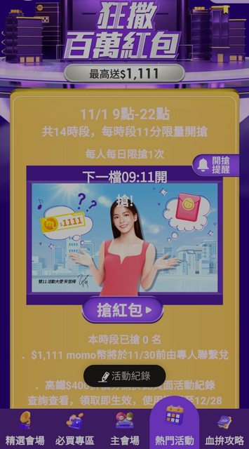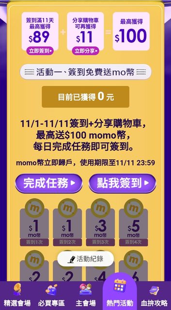 momo 11/1-11/11 簽到+分享最高得100mo 謝謝推文分享的連結: https://momo.dm/mVabVz 另外還有整點搶mo幣活動: https://i.imgur.com/6CYtpX4.jpg
