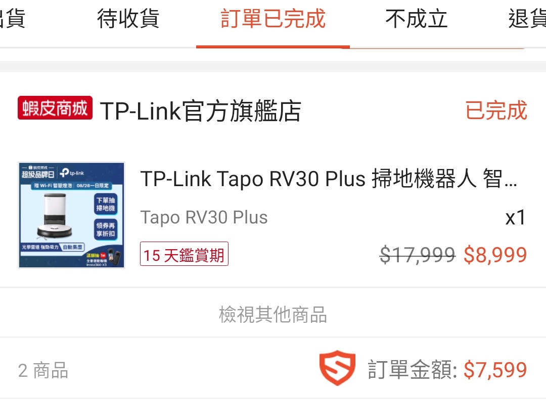 掃拖機器人 Tapo RV30 Plus $7,999 (~11/14) Tapo RV30 $5,699 (~11/30) 路由器 11/1~11/7 Deco X95 2入 $9,999 Deco X20 3入 $4,799 11/22~11/30 Deco X75 2入 $6,999 Archer AX12 $999 智慧家庭 11/8~11/14 Tapo D230S1 視訊門鈴 $2,999 Tapo C220 室內旋轉攝影機 $999 Tapo C500 旋轉攝影機 $1,111 Tapo Sensor 11/1~11/14 兩件95折 Tapo T100 行動感應器、Tapo T110 接觸式感應器 Tapo T310 溫濕度感測器、Tapo 315 溫濕度感測器 Tapo S200B / S200D 智慧按鈕 -- ※ 發信站: 批踢踢實業坊(www.ptt-club.com.tw), 來自: 118.168.136.232 (臺灣) ※ 文章網址: https://www.ptt-club.com.tw/Lifeismoney/M.1699249168.A.621
