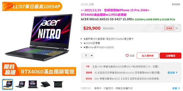 看了很久的筆電今天等到Acer超品日+快閃回饋終於下單完了 ACER Nitro5 AN515-58-5427 15.6吋 雙11價$29900 這台活動先用了-1500券現在下單還有911P幣回饋+Acer 5%p幣回饋 =29900-1500-911-1420=26069 最近PC資訊類的活動蠻多的,這幾天就是幾個大牌在輪流超品日 基本上超品日廠商都有加碼 今天有要買Acer的就可以多參考 活動網址: https://reurl.cc/x64Y5E 現在pchome全站是有指定筆電滿額登記最高2222P幣/1111p幣 今天11/7 Acer品牌加碼 >> 指定筆電滿額送最高2500P幣 (新增) >>指定筆電滿額登記送1111P幣 >>指定筆電滿額登記送888P幣 >>指定筆電滿額登記最高2222P幣 補充官網活動 >>買Acer指定筆電 >>官網登錄抽iPhone 15 Pro 256G >>官網登錄最高送LINE POINTS 2,000點 -- ※ 發信站: 批踢踢實業坊(www.ptt-club.com.tw), 來自: 101.137.76.179 (臺灣) ※ 文章網址: https://www.ptt-club.com.tw/Lifeismoney/M.1699288913.A.2E8