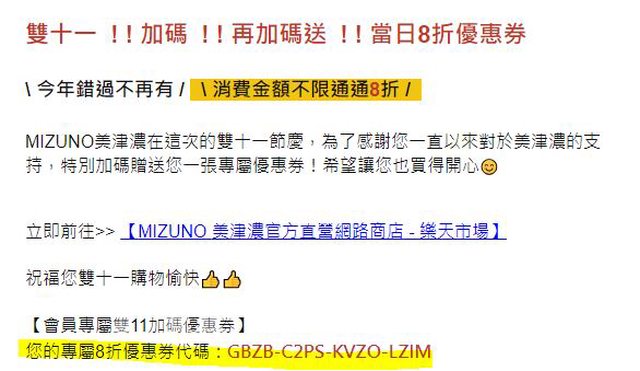 https://ppt.cc/fXClyx 剛開信箱時發現美津濃的活動信,裡面藏了11/11一日限定8折券 https://i.imgur.com/hcOZm3f.jpg