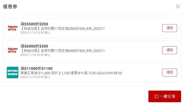 一般家飾品滿千免運 滿3500折200 滿6000折300 滿11000折1100 以上通通只到11/14 23:95 https://www.rakuten.com.tw/shop/nitori/ -- ※ 發信站: 批踢踢實業坊(www.ptt-club.com.tw), 來自: 1.168.123.206 (臺灣) ※ 文章網址: https://www.ptt-club.com.tw/Lifeismoney/M.1699950485.A.8C4