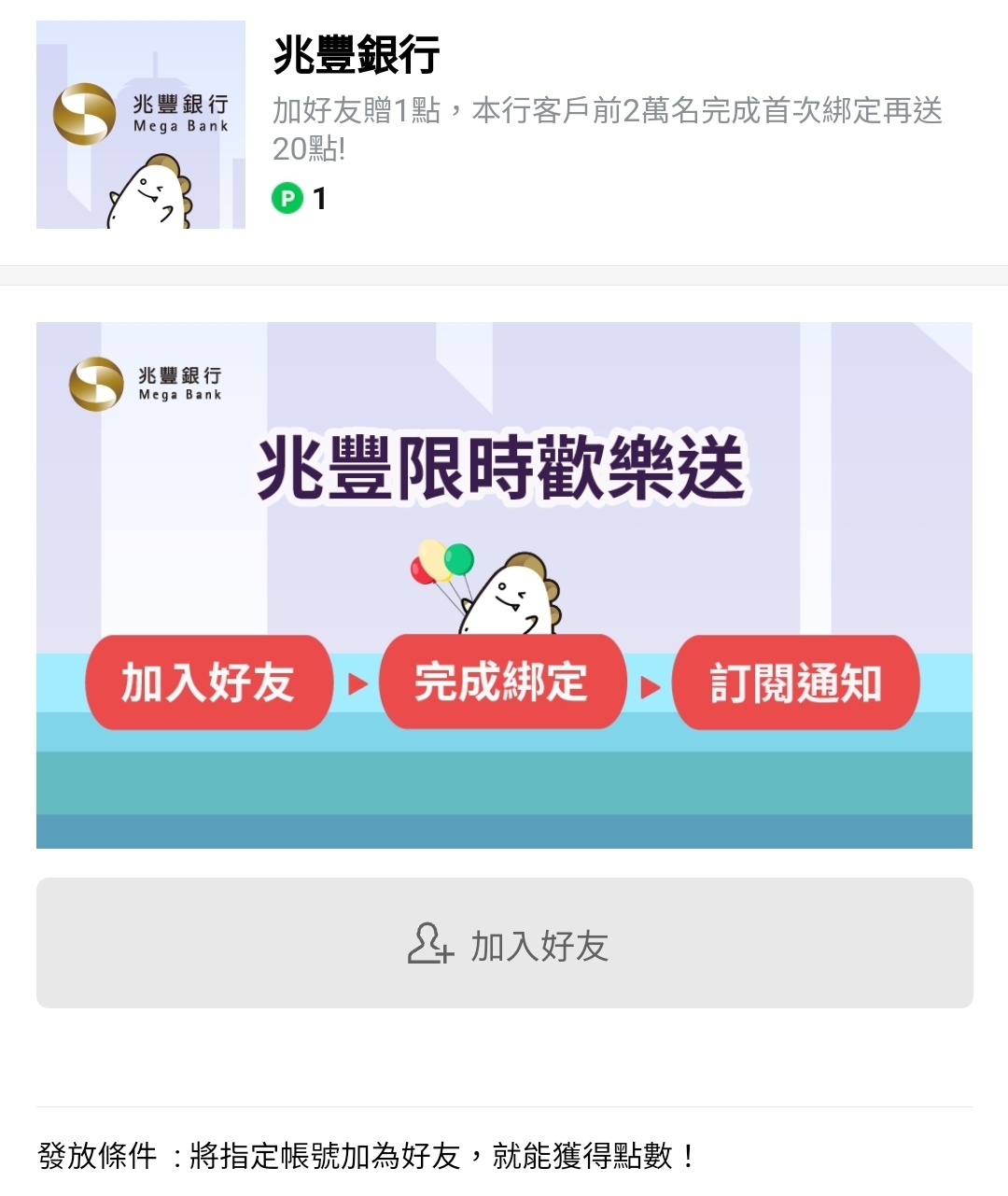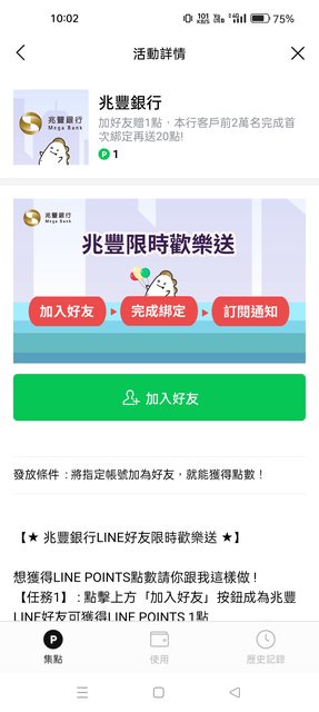 TZUYIC: 終於等到送點了,之前兆豐還推加入好友可101.136.169.254 11/15 10:15