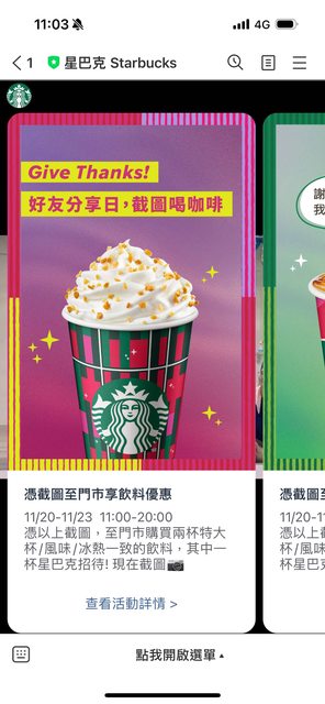 先加入星巴克官方LINE 就會收到此資訊囉 https://i.imgur.com/pP3eljD.jpg