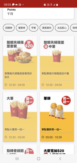 本週優惠 雙蝦天婦羅堡送中薯,再用1+1=50 選四塊雞塊配小可似乎還不錯,給大家參考。 https://i.imgur.com/uyw3cZD.jpg