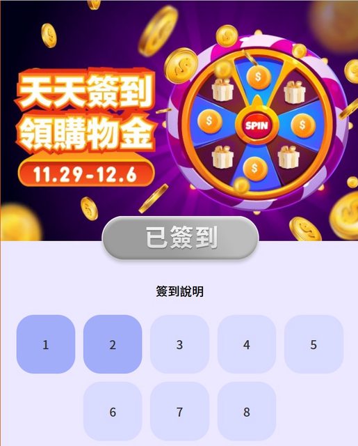 11/29-12/6天天簽到領購物金,最高抽968元