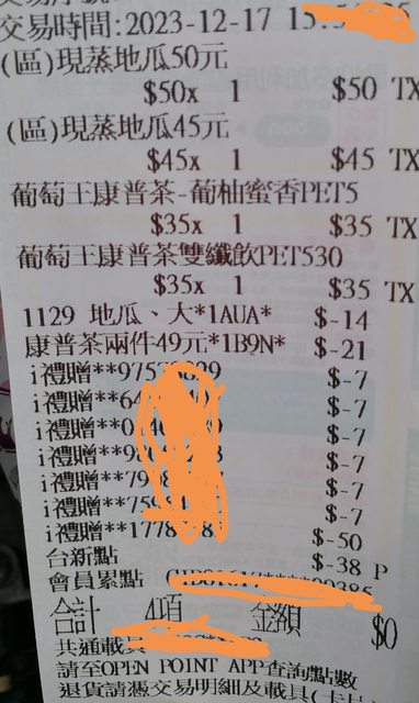12/12~12/16取貨購物金 使用期限到12/17 23:59截止 還沒用的記得用掉 如果想要發票 又使用台新pay結帳的人 記得結帳金額要大於台新點數 剛剛扣完購物金 剩下金額被台新pay點數扣光 店員告知這樣就沒發票了…… 地瓜的op點數好像也沒拿到…… 上次優酪乳有拿到活動op點數不知道是不是因為折扣完有餘額是用行動支付付款的 http://i.imgur.com/7bZmGR6.jpg
