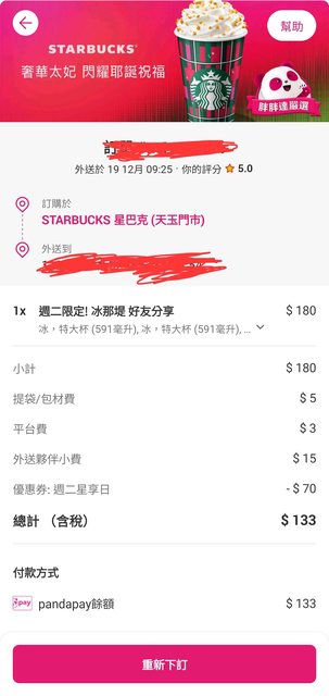 寒流來也!上星期的星冰樂被拿掉了,但是好喝的冰拿鐵又回來了。可惜沒熱的選項。 有熊貓會員會差30元達到免運,可以+麵包或加重咖啡+$15×2 半價+‘週二星享日’=118 這個是熊貓常態優惠,都不好意識po了。 https://i.imgur.com/yCOOEAT.jpg