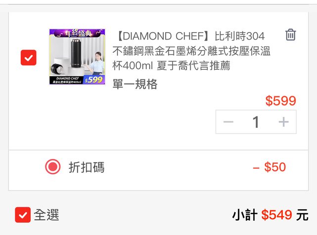 DIAMOND CHEF 按壓式保溫杯549 12/22-12/31 限時特價$599 結帳輸折扣碼PA50還可以折50 搜了一下momo要1142 https://i.imgur.com/Bck7WTo.jpg
