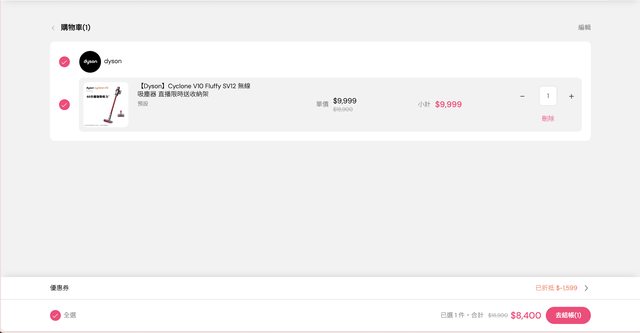 從上次在這平台買了dyson吹風機之後就有一直在關注,現在又看到吸塵器也上架了 現在v8 v10都有特價,搭配平台優惠v10只要8400就有了 https://reurl.cc/orLkD5 https://i.imgur.com/MuAtRaU.png