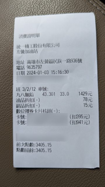 肉身實測統一精工速邁樂 禮拜三開心卡和現金一樣 滿35公升也是降1.8元/L+15元 加了43.301公升折78+15元 https://i.imgur.com/XRw03RP.jpg
