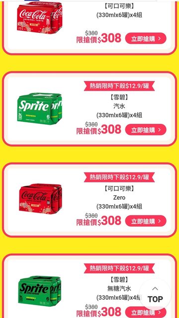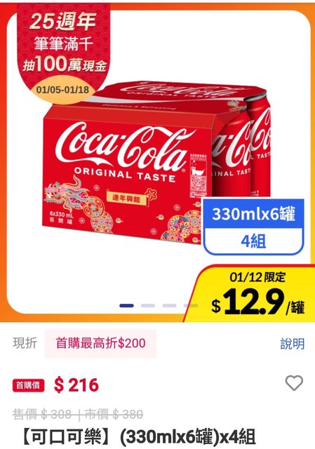 可樂雪碧 有糖無糖今天都有特價,點進去看一樣首購一箱是216