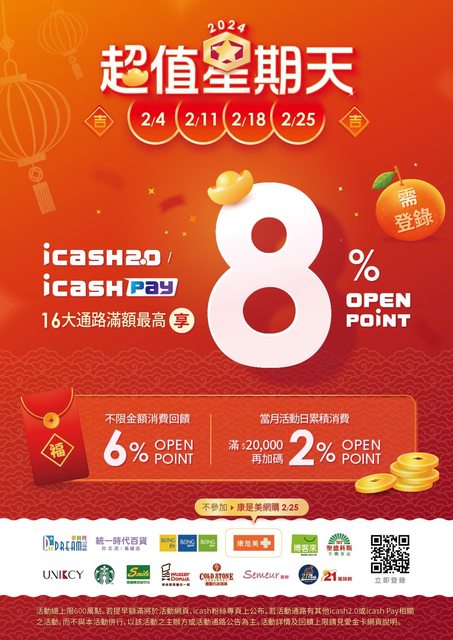 回饋消費金額之2% OPENPOINT,活動期間icash Pay 與icash2.0於活動通路合併計算每戶/