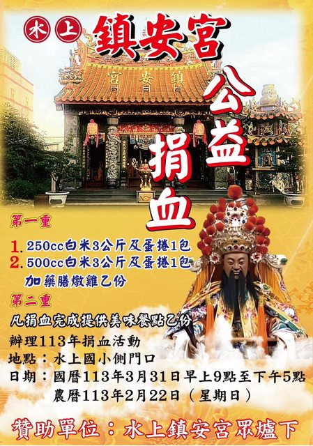 3/31(日):嘉義水上國小側門 09:00~17:00 送米3kg+蛋捲/加贈藥膳燉雞