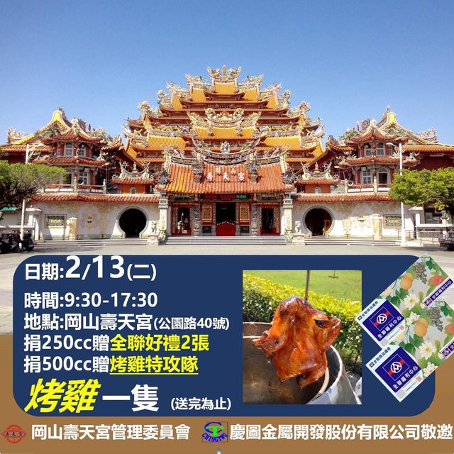 2/13(二):高雄岡山公園路40號 09:30~17:30 送全聯禮券$200/烤雞一隻
