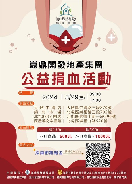 3/29(五):台中各指定捐血點 09:00~17:00 送7-11禮券$600/$1000