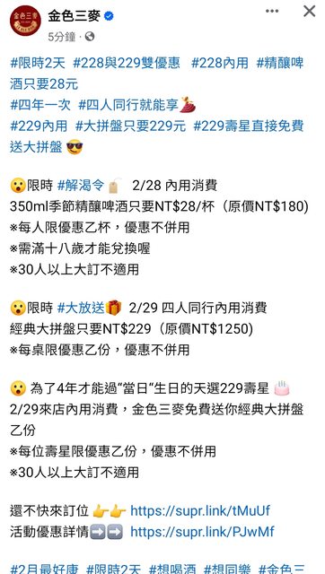 #限時2天 #228與229雙優惠 #228內用 #精釀啤酒只要28元 #四年一次 #四人同行就能享 #229內用 #大拼盤只要229元 #229壽星直接免費送大拼盤 限時 #解渴令 2/28 內用消費 350ml季節精釀啤酒只要NT$28/杯(原價NT$180) ※每人限優惠乙杯,優惠不併用 ※需滿十八歲才能兌換喔 ※30人以上大訂不適用 限時 #大放送 2/29 四人同行內用消費 經典大拼盤只要NT$229(原價NT$1250) ※每桌限優惠乙份,優惠不併用 為了4年才能過“當日“生日的天選229壽星 2/29來店內用消費,金色三麥免費送你經典大拼盤乙份 ※每位壽星限優惠乙份,優惠不併用 ※30人以上大訂不適用 還不快來訂位 https://supr.link/tMuUf 活動優惠詳情 https://supr.link/PJwMf #2月最好康 #限時2天 #想喝酒 #想同樂 #金色三麥滿足你 #229壽星享更多 #別這樣 #他四年才能過一次當日壽星 #全台金色三皆適用 #為歡聚而誕生 金色三麥 -- ※ 發信站: 批踢踢實業坊(www.ptt-club.com.tw), 來自: 180.217.17.220 (臺灣) ※ 文章網址: https://www.ptt-club.com.tw/Lifeismoney/M.1709022759.A.10E
