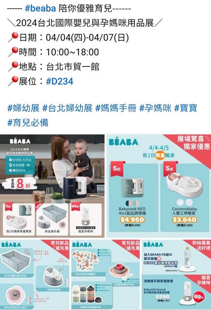 猶豫很久到底要不要買的副食品調理機 今天看到BEABA在台北婦幼展上有首2日限量五折的優惠 覺得很划算!! 展場上調理機只要4950 連睡窩也是五折下來3840 https://i.imgur.com/iL8lB4S.jpeg