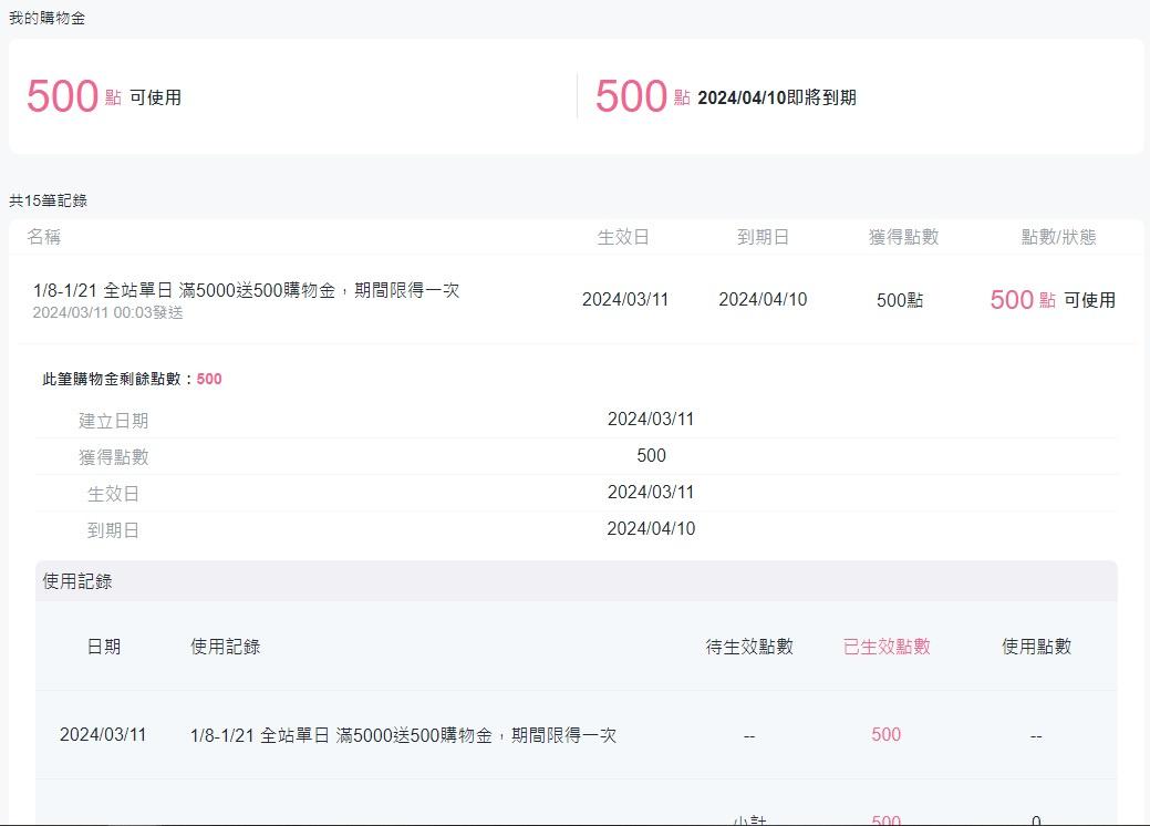 jay0215: 我的是500點,但要滿5000送500購物金 QAQ 118.167.218.22 04/08 15:01