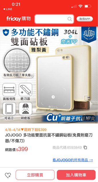JOJOGO不鏽鋼砧板$399 家裡一直都用木頭砧板 觀望一陣子想下手這塊 一面不鏽鋼一面是PP 用不習慣還可以翻面XD JOJOGO 多功能雙面抗菌不鏽鋼砧板 免運$399 活動時間:4/8-4/14 比過價了 PC499 MO460要運費 https://i.imgur.com/6nANSfc.jpg