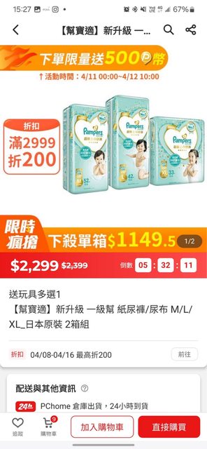 P家今天特賣一級幫黏貼兩箱組2299+送玩具 下單就送500P幣 加上P幣折扣 單箱算起來只要899 https://24h.pchome.com.tw/prod/DAAOAT-1900GLHSK https://i.imgur.com/U6qFWLN.jpg