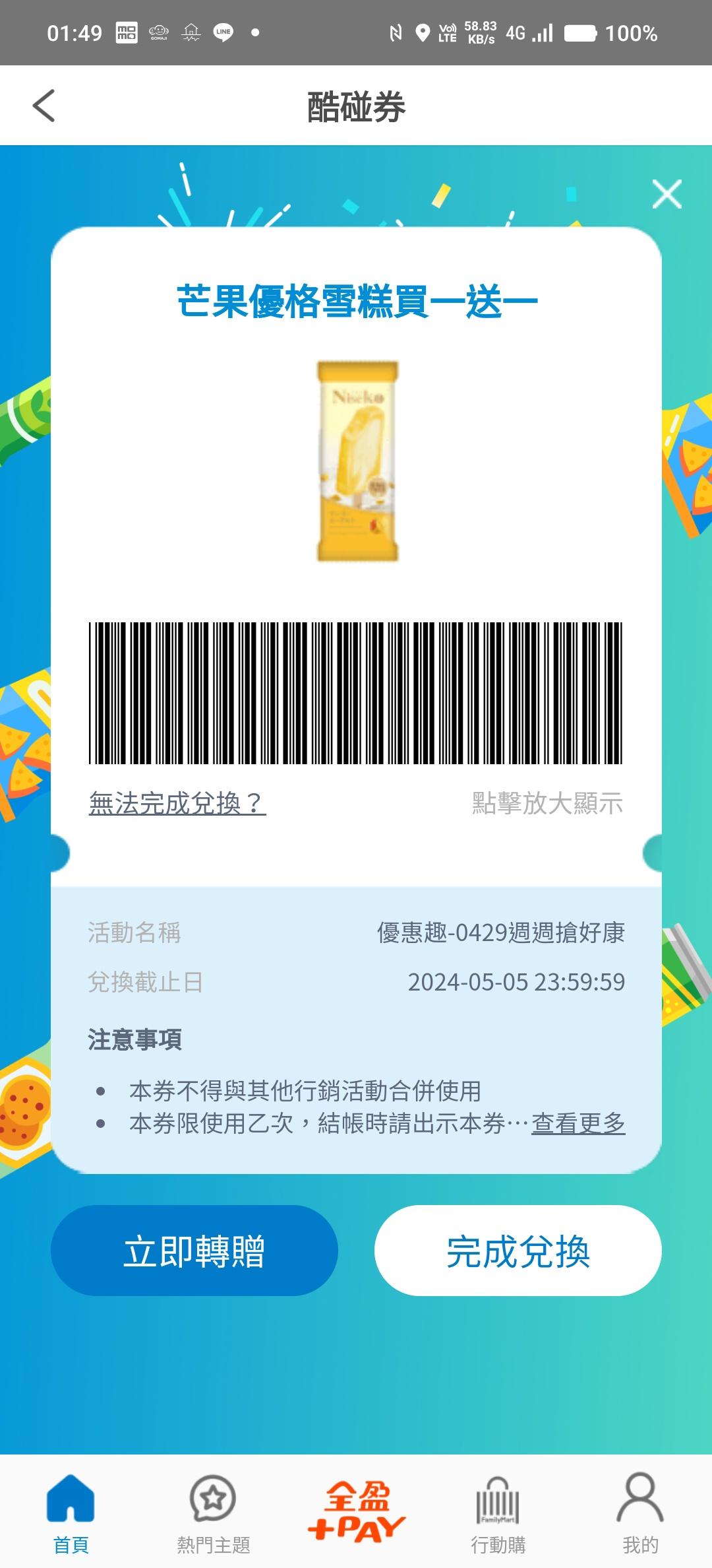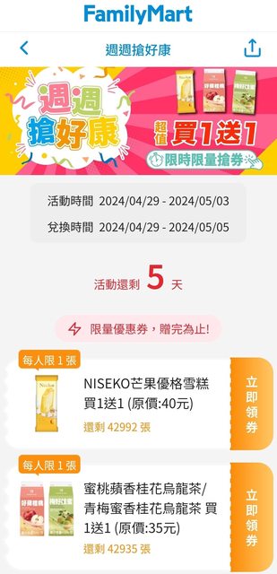[情報] 全家週週搶好康 APP領取買一送一優惠券 -- ※ 發信站: 批踢踢實業坊(www.ptt-club.com.tw), 來自: 1.200.170.172 (臺灣) ※ 文章網址: https://www.ptt-club.com.tw/Lifeismoney/M.1714358386.A.8E1