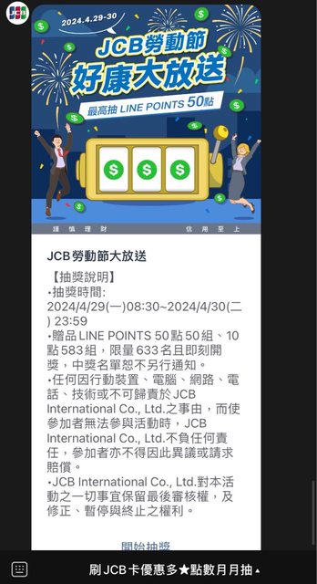 如題 Line JCB 勞動節抽點數 https://i.imgur.com/q11XCNa.jpeg