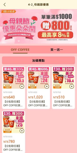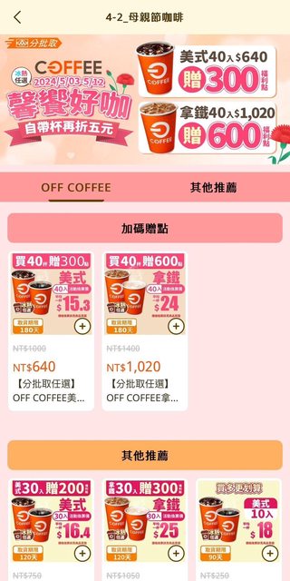 2.5/10-5/12 美式咖啡買40杯送300福利點 拿鐵買40杯送600福利點 https://i.imgur.com/utDY5VY.jpeg