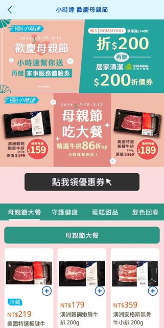 統整了一下近期小時達跟分批取的活動給大家 接近母親節活動變超多,大家自行選用需要的 『小時達』 1.5/10-5/12 消費滿1,400輸入優惠碼【MOMMYDAY】 折200元+生活大管家折價券 >> 生活大管家就是幫忙打掃的,可以送爸媽用 https://i.imgur.com/zQ4j9CA.jpeg