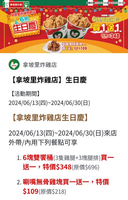 6塊雙響桶 NT348 買一送一 3 腿排+3 雞腿 無骨雞塊 NT109 買一送一 看文案裡沒有加一些奇怪的形容詞,酷酷滋滋腿排之類的,有這種形容詞八成是縮水版 平均一塊 29,在官網試著點了一次跟一般炸雞一樣能換義式原味,如果是一般 size 的話 那蠻划算 -- ※ 發信站: 批踢踢實業坊(www.ptt-club.com.tw), 來自: 1.200.242.127 (臺灣) ※ 文章網址: https://www.ptt-club.com.tw/Lifeismoney/M.1718271337.A.D55