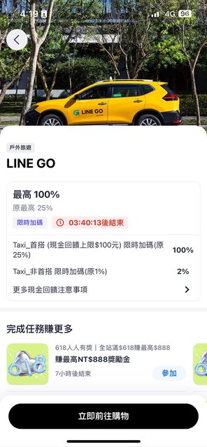標題[情報] LINE GO 首次搭車 ShopBack 回饋 100%