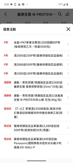 發文時可用 Ctrl+Y 刪除以下提醒 發文需要有省錢點。 我買6盒組乳清x2湊到3998結帳才發現不是只送3888這檻500P幣,而是累積前兩檻100+150 總共850,相當再79折 還有額外的3888登記送500P,但因為沒辦法馬上登記不算再內 另外也發現義美生醫的全保健食品都有參與到,我沒什麼買保健食品,有興趣的人可以參 考看看 https://24h.m.pchome.com.tw/store/DBBZ65?sort=rnk/dc https://i.imgur.com/iyRG4vT.jpeg