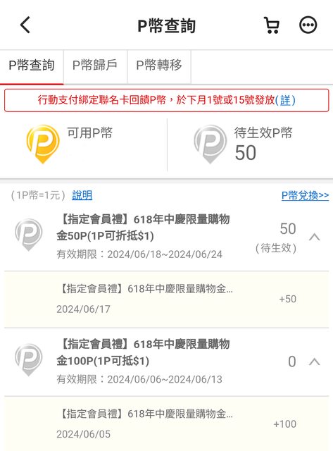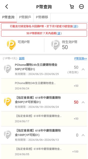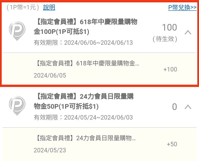 :   : ※ 引述 《jht37》 之銘言: : :   : : 果然618前夕再一波撒幣XD : :   : : 各位可以抽空查看,因為它發放條件可以說是沒有什麼準則XD : :   : : 有可能某帳號連續幾波都有(只是每次金額可能不同)、有可能某帳號怎樣就是沒有XD : :   : : 另外它都是先發放、隔天才會生效。所以你在主頁面的地方看到可能是0P幣、記得要再 : 進 : : 去下個頁面,看一下「待生效P幣」那邊有無顯示金額。 : :   : : 有的話可以先準備一下要買什麼,祝各位消費愉快XD : :   : : https://i.imgur.com/4r31Chz.png